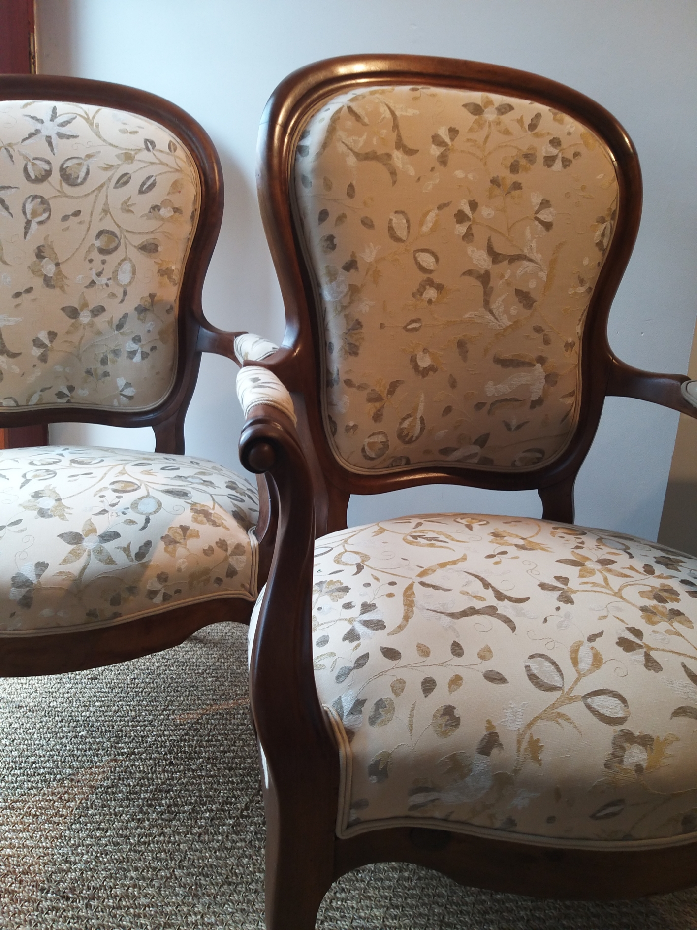 Les fauteuils d’époque ont été entièrement restaurés dans les règles de l’art de la tapisserie du XIXème : les bois décapés et patinés, la suspension des assises avec 11 ressorts biconiques/assise guindés en quatre, les garnitures remodelées en crin et entièrement restaurées, le tissu posé tendu sur une couche de ouate avec une passementerie en finition.